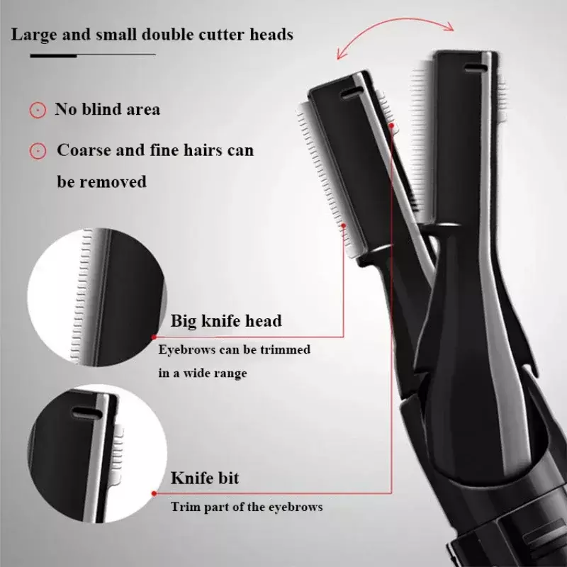 3.FÁCIL OPERAÇÃO: A cabeça mais longa e de tamanho normal é usada para aparar cabelos grossos, enquanto a outra cabeça pequena de precisão ajuda a remover o excesso de pelos e detalhar com precisão a sobrancelha, visando cuidadosamente mesmo nas áreas mais pequenas para manter a forma perfeita.