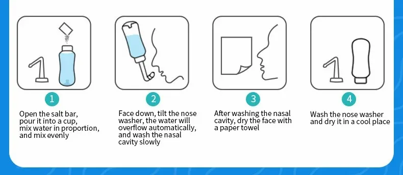 Aliviar o desconforto. -Garrafas de limpeza nasal ajudam a aliviar os sintomas de irritação nasal comum, como febre do feno, fumaça, rinite, espirros, poluição urbana, etc. Garrafas de limpeza de nariz removem suavemente a sujeira, poeira e outros contaminantes.