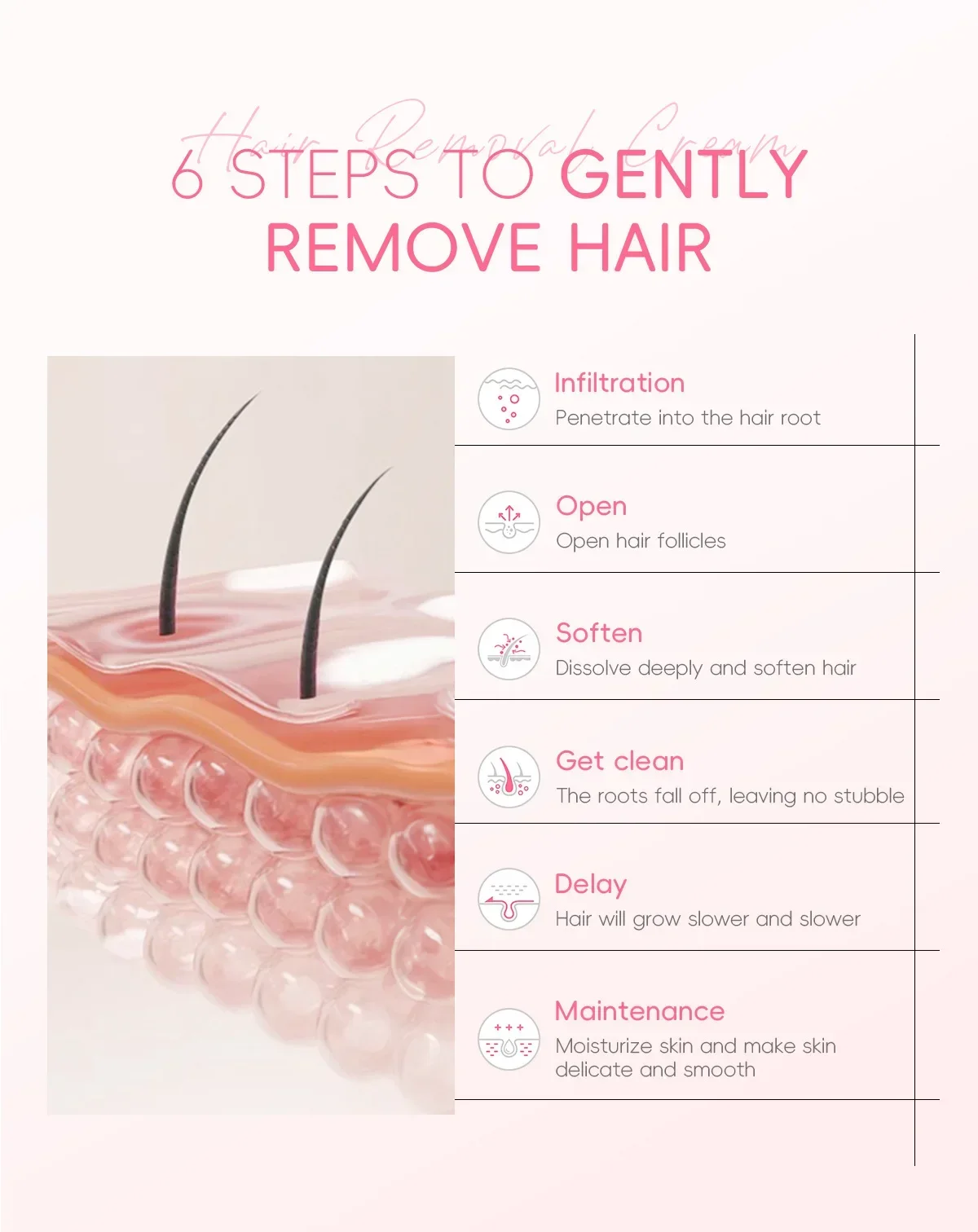 Hidrata e suaviza as raízes dos cabelos, remove facilmente os pelos sem agredir a pele, deixando a pele limpa sem manchas pretas e devolve sua pele lisa e macia com charme total.