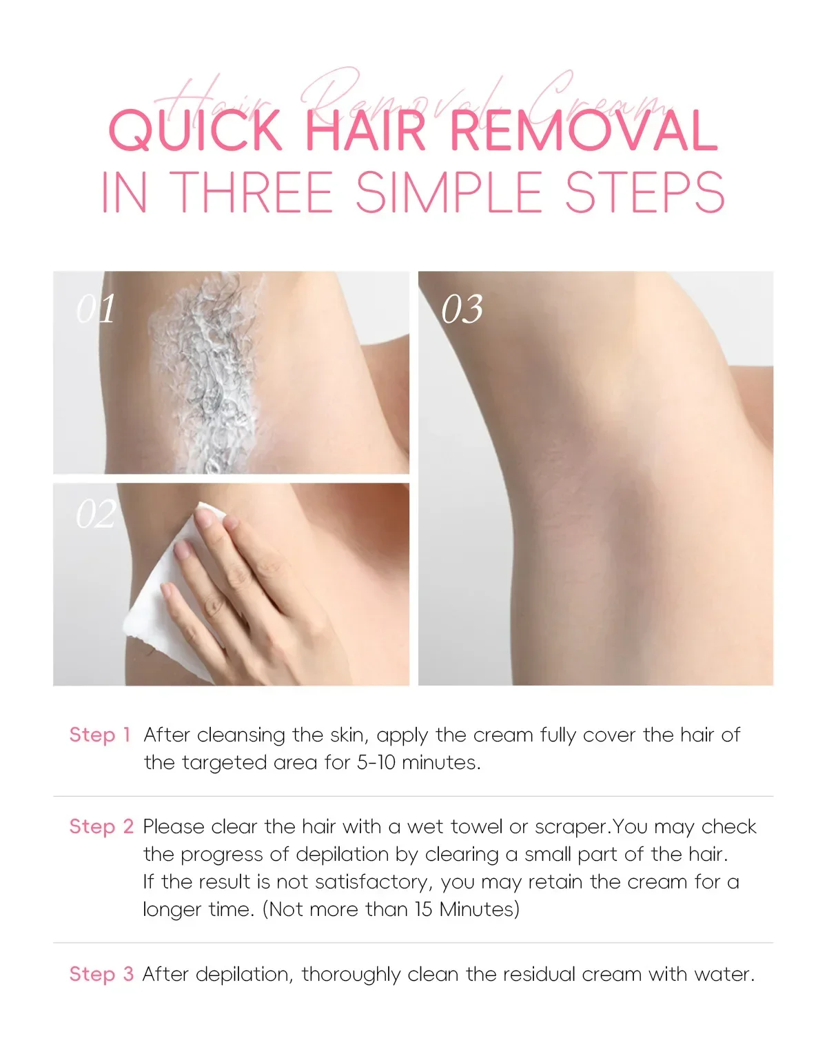 o progresso da depilação limpando uma pequena parte do cabelo. Se o resultado não for satisfatório, você poderá reter o creme por mais tempo.(Não mais que 15 minutos)